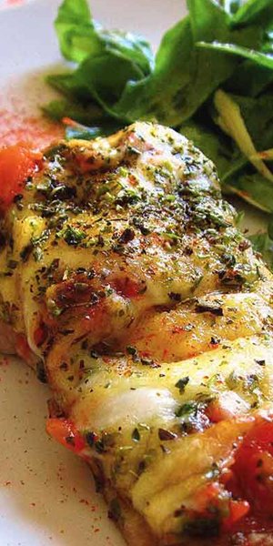Especialidad con surubí acompañado de una salsa roquefort con hojas de rúcula. Plato principal de sabor característico.