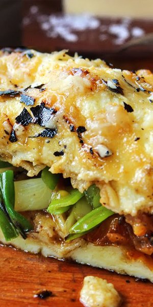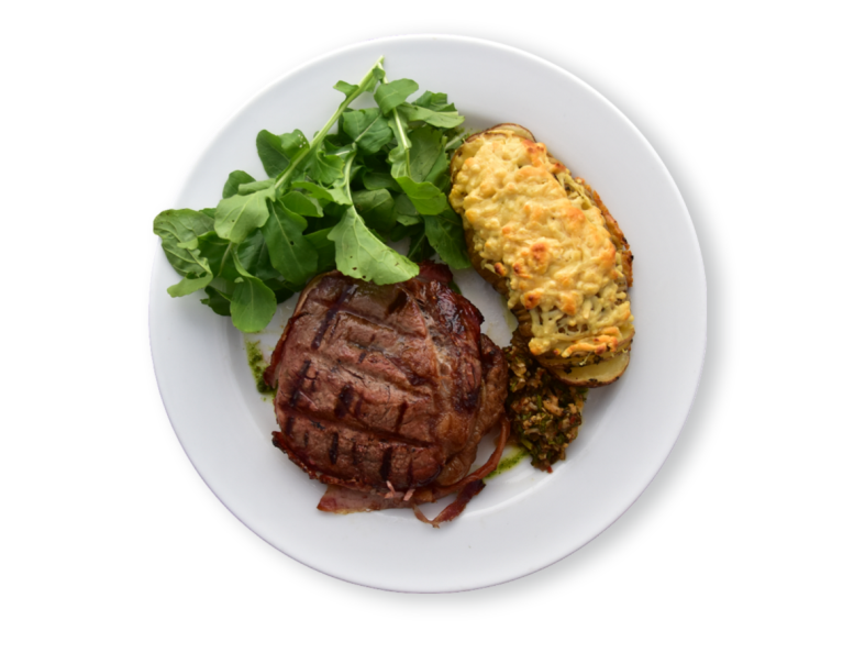 Late la tierra colorada con el exquisito ojo de bife abrazado por la panceta y la sazón del chimichurri de hierbas. Acompañado de papas laminadas y queso derretido.