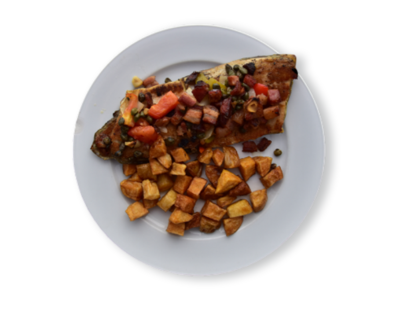 La boga desafía las opciones acompañada por unas papitas salvajes y una guarnición extra de panceta, morrón y cebolla. Anímate a este sabor original!