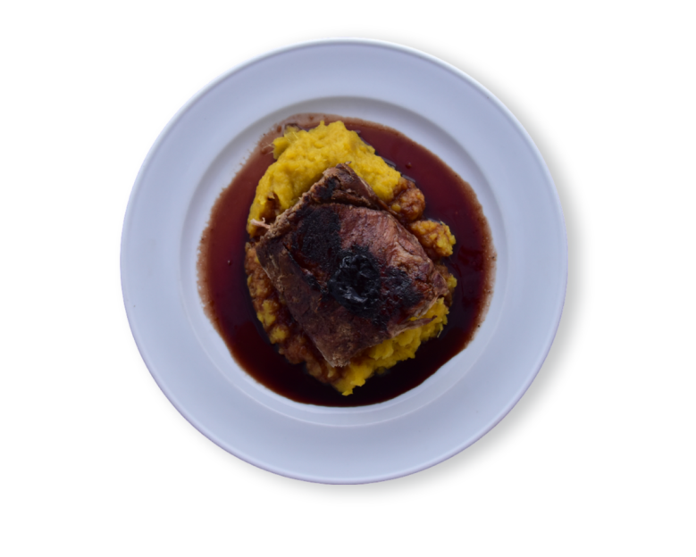 En el corazón de la selva misionera, la suculenta bondiola se funde con puré de batatas bajo la dulce esencia de ciruelas y oporto.